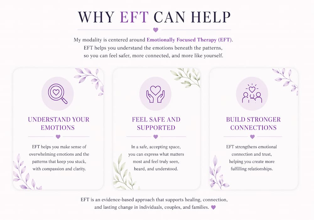 Using Emotionally Focused Therapy (EFT), I help you understand your emotions, shift patterns, and build more meaningful connections.